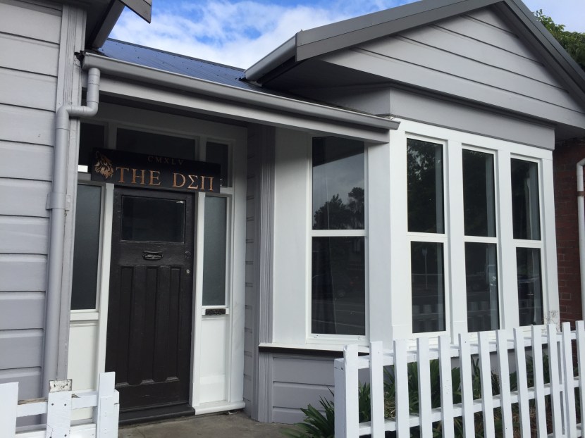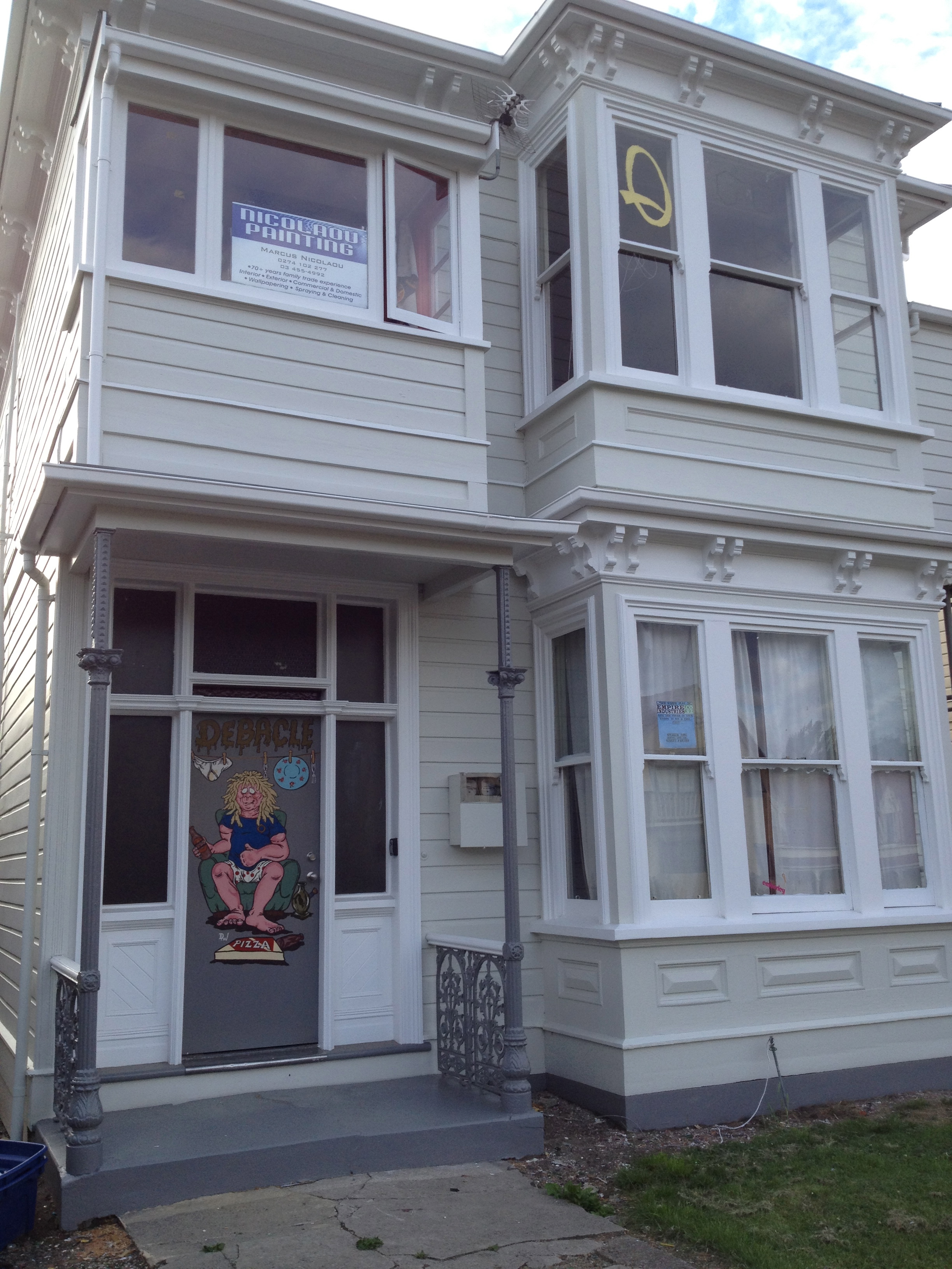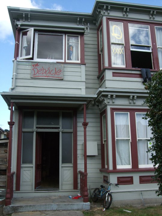 Wandering down Cumberland Street today, you can clearly see a vividly painted door depicting a student in boxer shorts, seated on a green chair holding a stubbie of beer, and flanked by a bong. In the foreground on the floor sits an unopened pizza box. Above and behind the student’s head hangs a washing line, debecked with y-fronts, a plate, fork and knife. The word Debacle is emblazoned above in what can only be described as a colour and texture reminiscent of fecal matter. It’s the kind of scene some may imagine as a typical student flat. Interestingly, the the story behind the name is quite different.