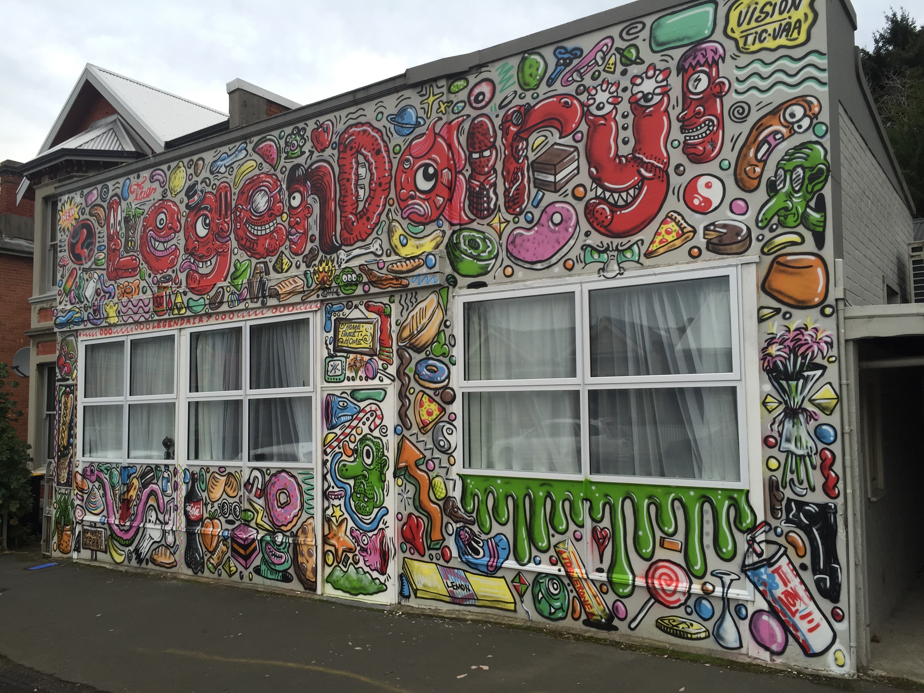 Jersey caramels, jelly snakes, pies and bananas feature on this extraordinary mural by local artist and Art Teacher, Jonathan Waters. The mural is painted on a Duke Street flat is owned by property developer Mike Harbott and references the buildings past life as a local dairy.