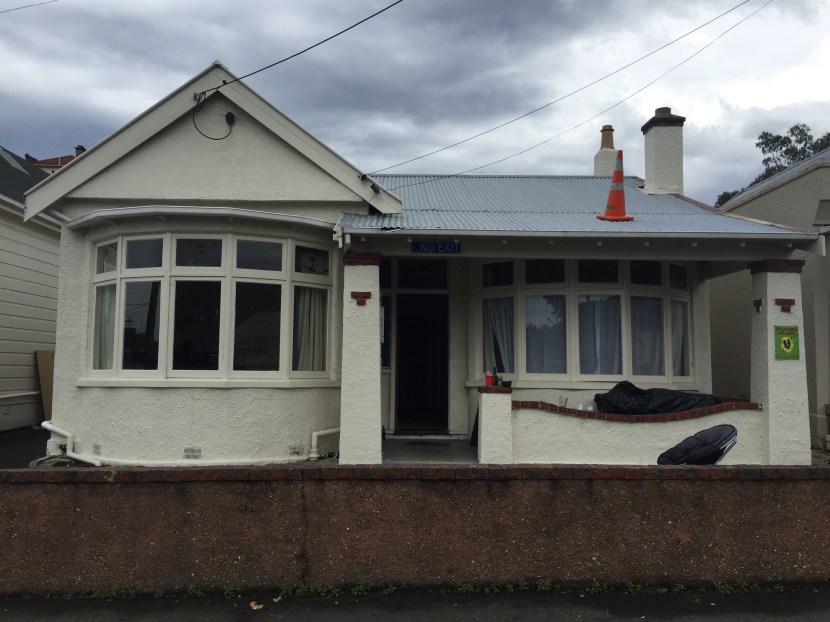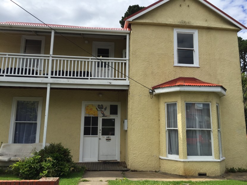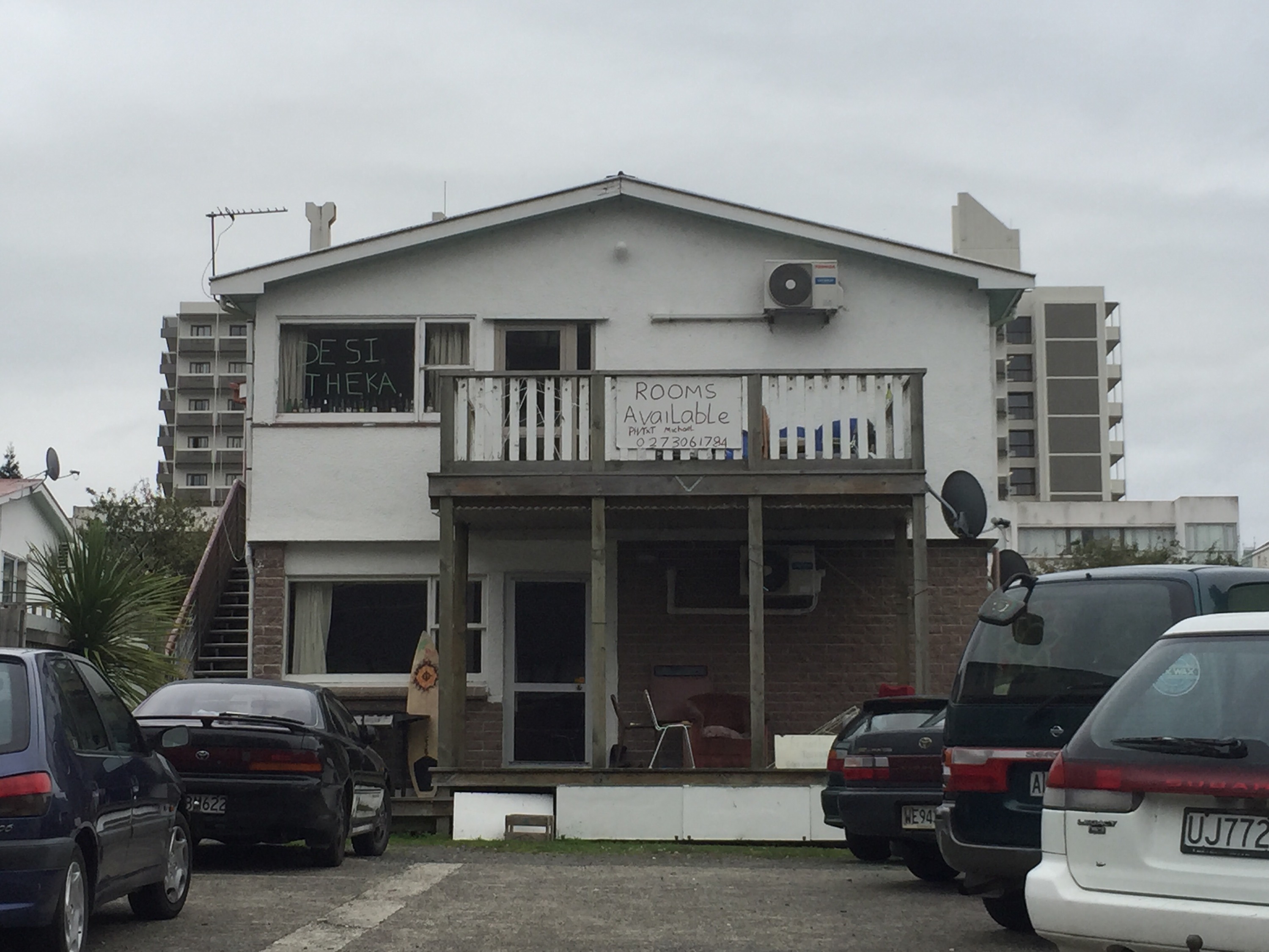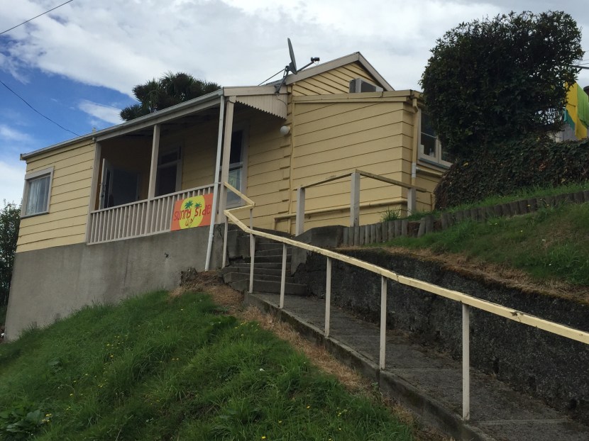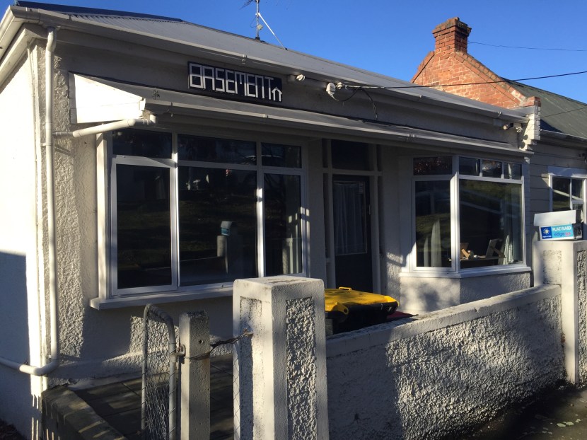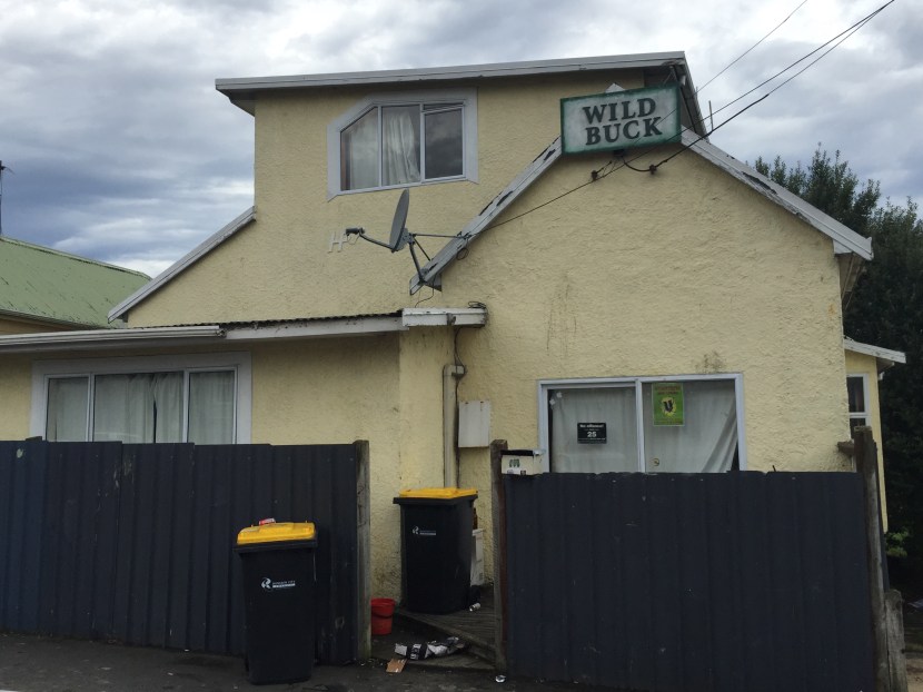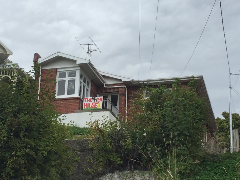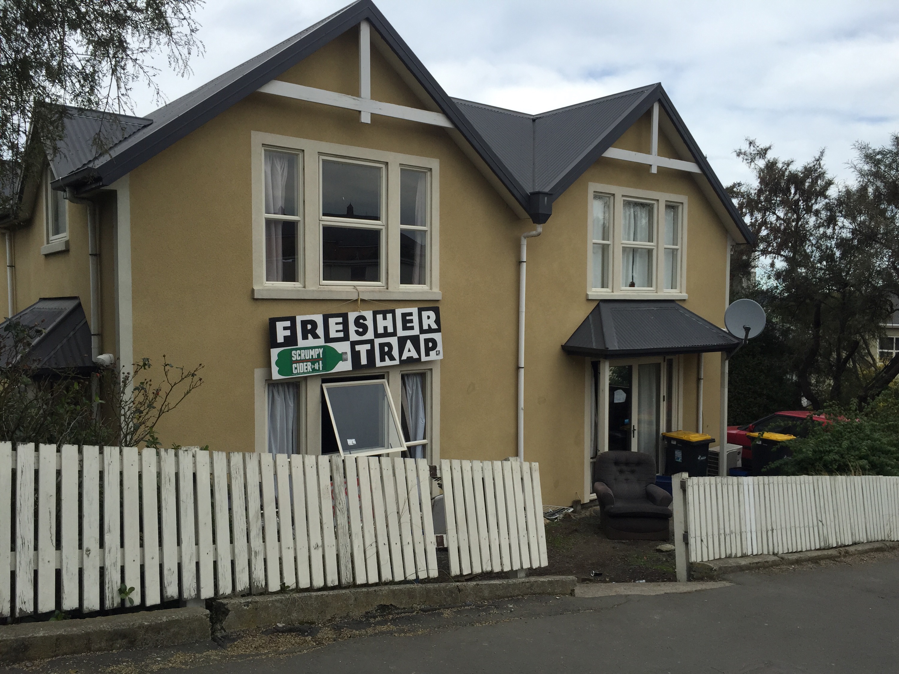 Beautiful paint job on what appears to be an upside down single bed- head. Bed heads have, over the last 20 years particularly, formed a popular medium for flat signs in Dunedin.