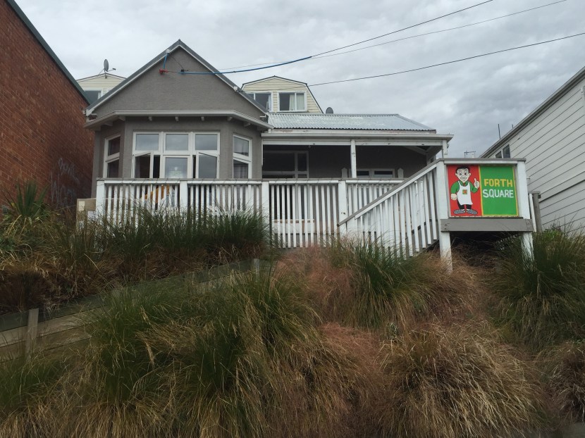A beautifully crafted sign playing on the name of Forth Street and the well known NZ supermarket franchise, Four Square. The Four Sqaure man was designed by the parent company, Foodstuffs, in the 1950s. [1]